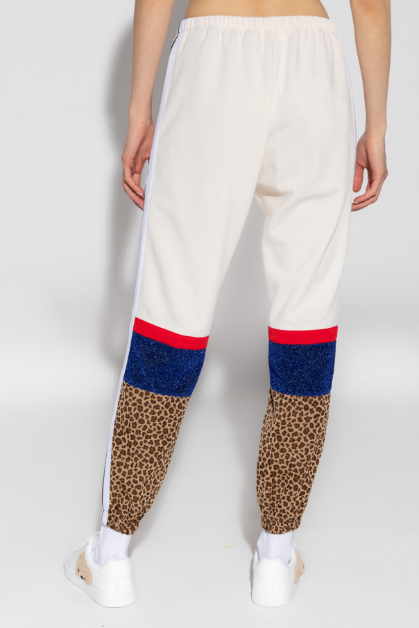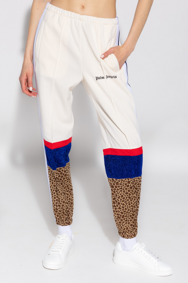 Cream trousers from Palm Angels. Fastened with drawstrings, this pair features an elastic waistband, logo print, two slip pockets, decorative inserts and animal motif.