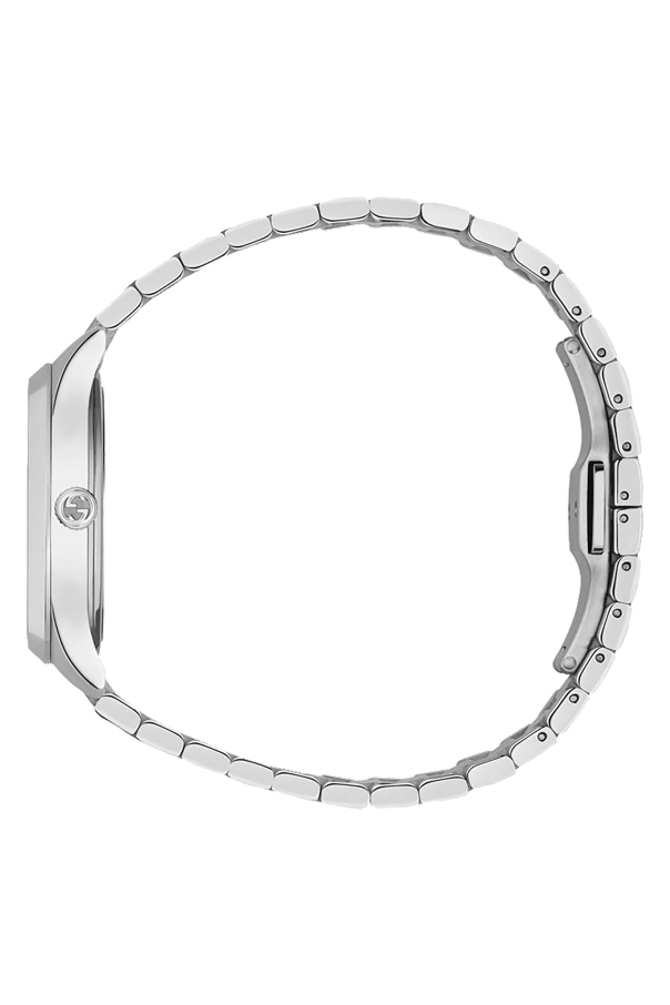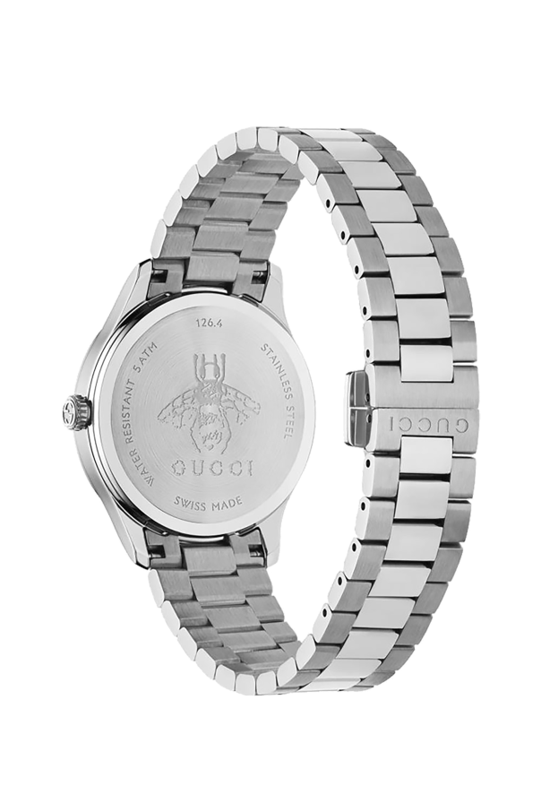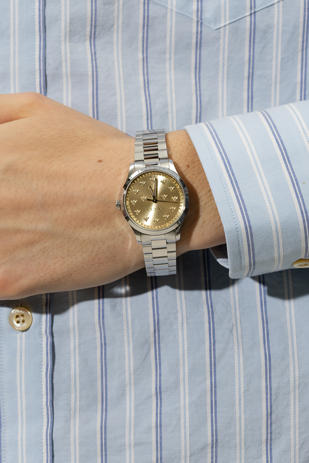 Silver-tone and gold-tone ‘G-Timeless’ automatic watch from Gucci. With a 32mm steel case, this model features a yellow gold dial enriched by the brand\'s signature engraved bee and logo, sapphire glass with antireflective coating and a steel bracelet with a branded fastener.