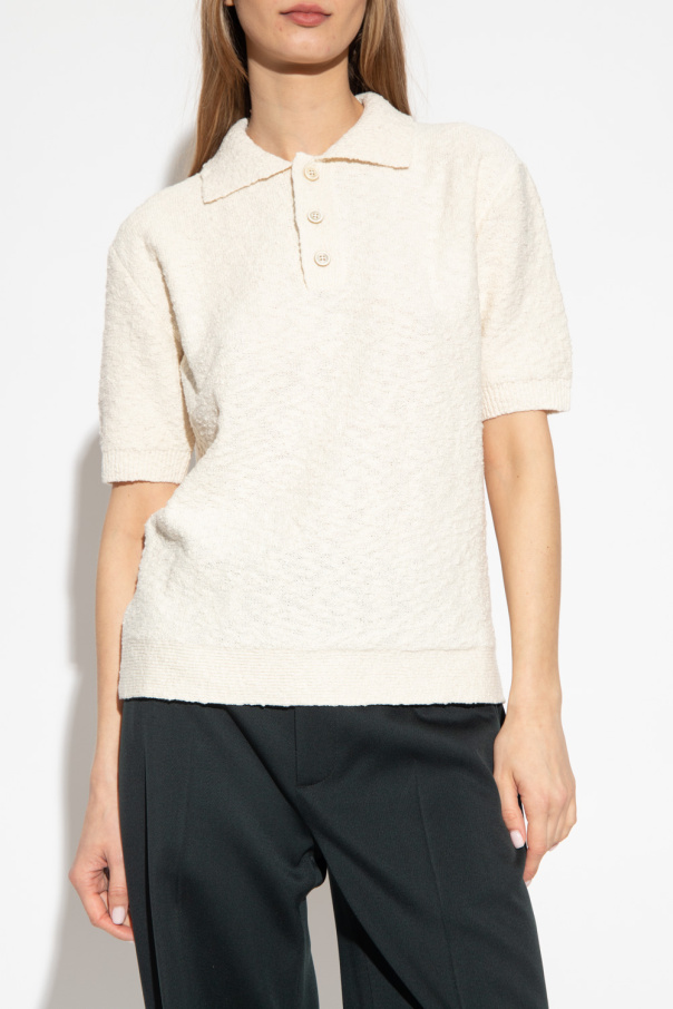Cream polo sweater from Maison Margiela. Crafted from cotton, this style features a three-button placket, short sleeves and a ribbed bottom hem and cuffs.