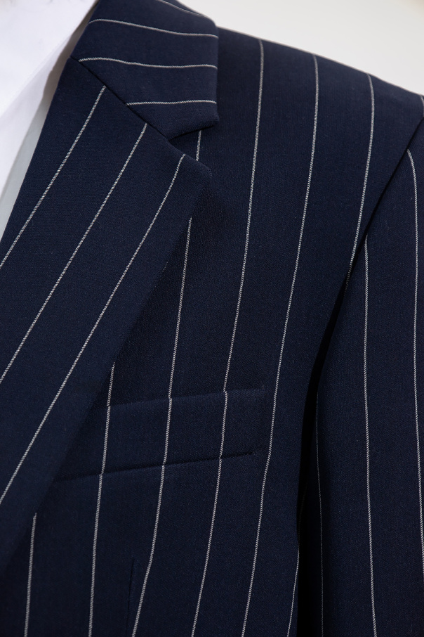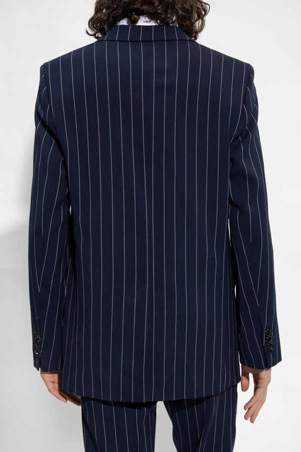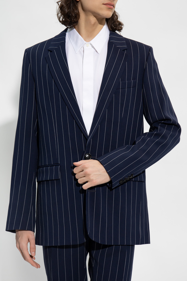 Navy single-breasted blazer from Ami Alexandre Mattiussi. Made of virgin wool, this loose-fitting design features button fastenings, a white pinstripe pattern, notch lapels, two flap pockets, one slip pocket, single rear vent and long sleeves with buttoned cuffs.