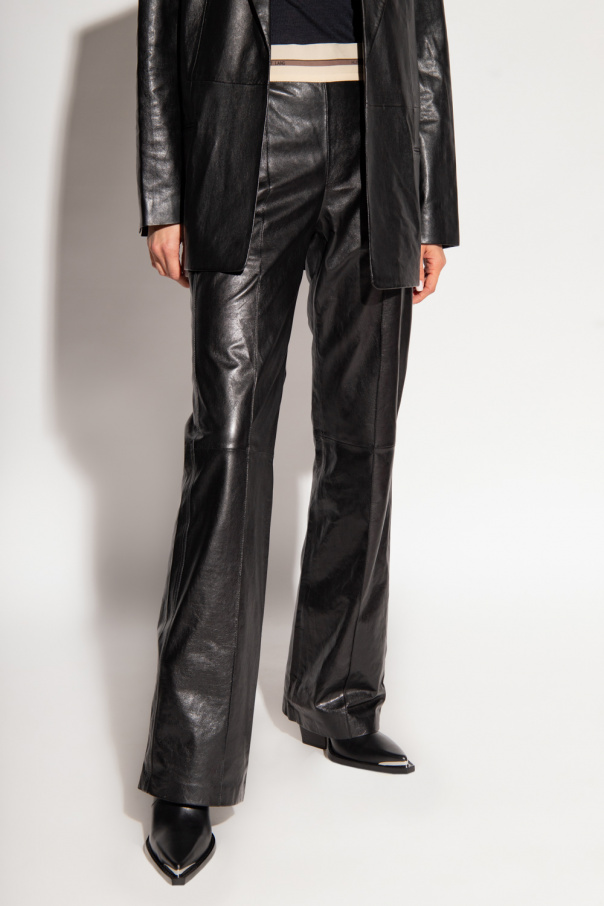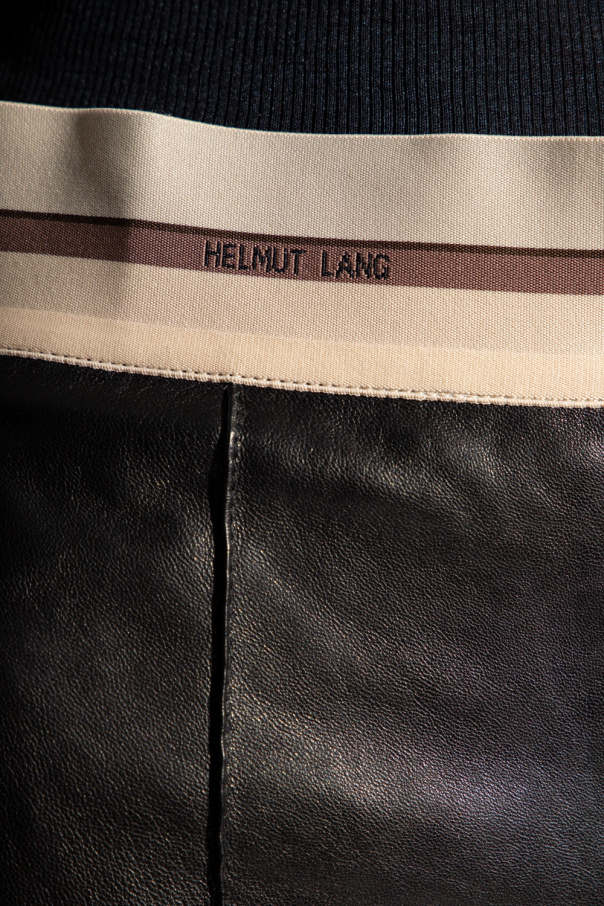 Black trousers from Helmut Lang. Crafted from sheep leather, this pair features a side zip, elastic waistband with a logo in beige and brown, four slip pockets and slightly flared legs.