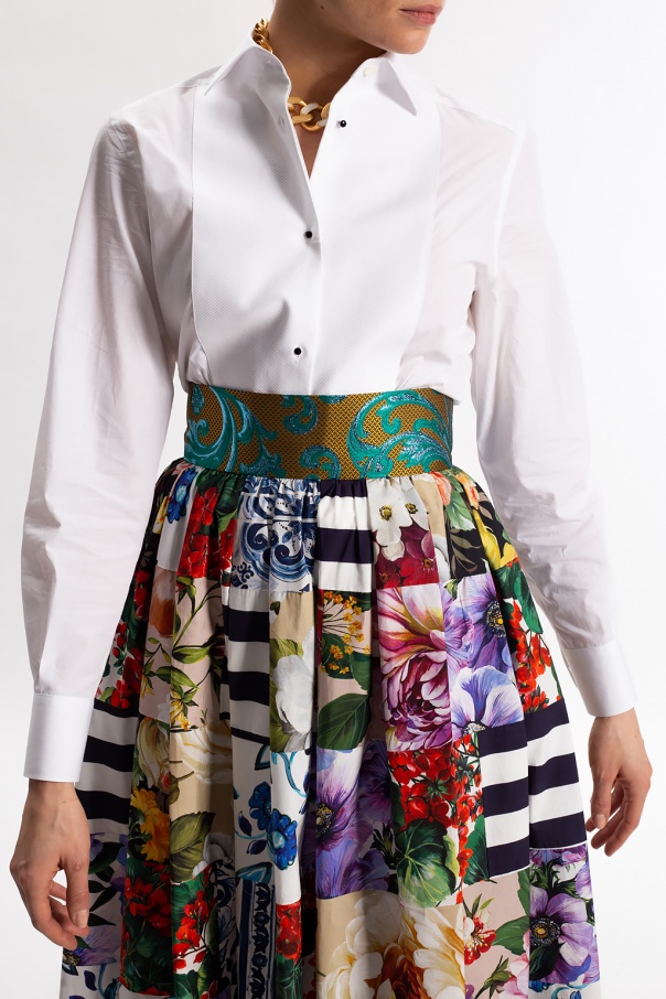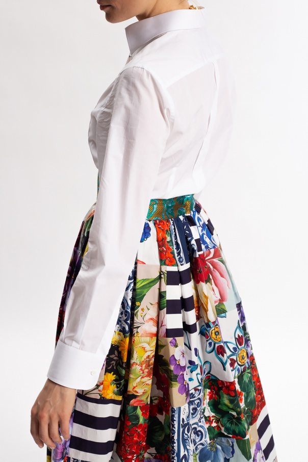 White shirt from Dolce & Gabbana. Crafted from cotton, this garment features button fastenings and a mesh-trimmed appliqué.