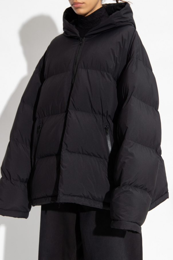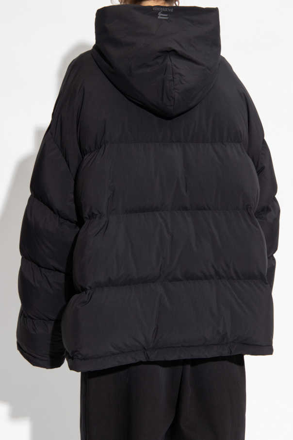 Black oversize quilted jacket from Balenciaga. Fastened with a two-way zip, this garment features a logo-embroidered hood, two zip pockets and drawstrings at the hem and cuffs.