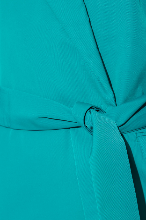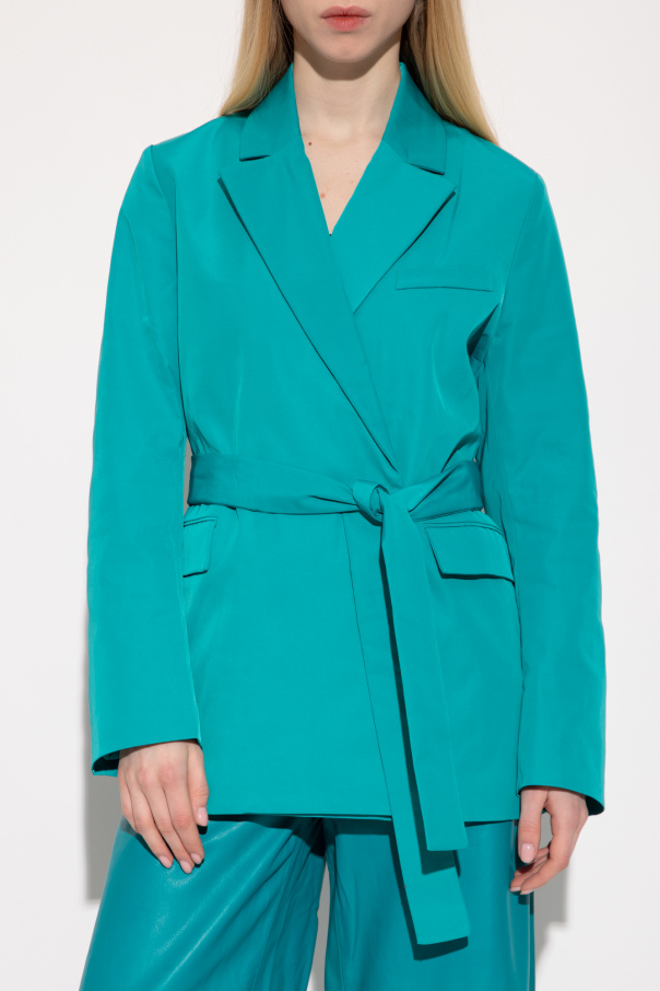 Blue ‘Maren’ double-breasted blazer from Samsoe Samsoe. Crafted from partially recycled material with a shimmering effect, this style features hidden snap closures, a waist-cinching belt, two flapped pockets, one slip pocket, peak lapels and long sleeves.