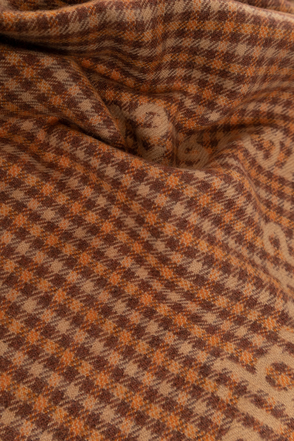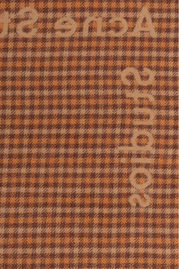 Beige, brown and orange reversible scarf from Acne Studios. Made from wool, this item features fringes on shorter edges and the brand's logo embroidered on both sides. One side is plain, the other one has a houndstooth check pattern.