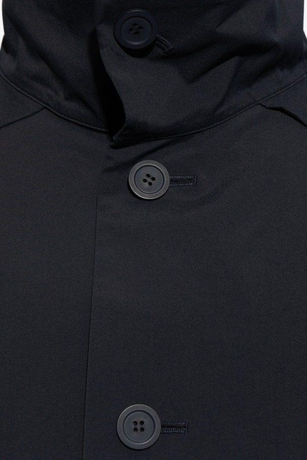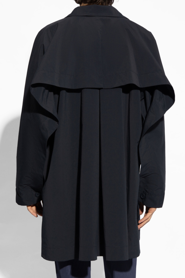 Introducing the epitome of timeless elegance and functional design, the Navy Stand Collar Coat by the renowned Issey Miyake Homme Plissé. Crafted from a smooth, high-quality polyester fabric, this coat exemplifies the brand\'s dedication to innovative yet wearable fashion. Its dominant navy hue offers a classic, versatile appearance that seamlessly integrates into any wardrobe. The coat\'s silhouette is effortlessly stylish, featuring a loose fit that promises comfort without compromising on style. It is designed to serve as a sophisticated outer layer, perfect for transitioning through seasons. The stand collar adds a touch of elegance and serves as a shield against the chill, while the meticulous button closure, matched in fabric color, highlights the garment\'s subtle luxury. Each button is finely detailed, reflecting the garment\'s overall premium quality. Additional functionalities include a back pleat for enhanced volume and movement and traditional sleeve construction with buttoned cuffs, adding to its refined look. Notably, the coat is adorned with two concealed pockets, offering practicality alongside its stylish demeanor. Why Purchase This Coat? Timeless design by Issey Miyake Homme Plissé, suitable for various occasions. High-quality polyester fabric ensures durability and a smooth feel. Elegant stand collar and precise button details add a distinctive touch. Functional features such as a back pleat and concealed pockets enhance wearability. Free of overt branding, offering a sophisticated, minimalist appeal.
