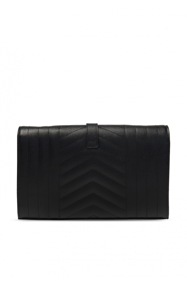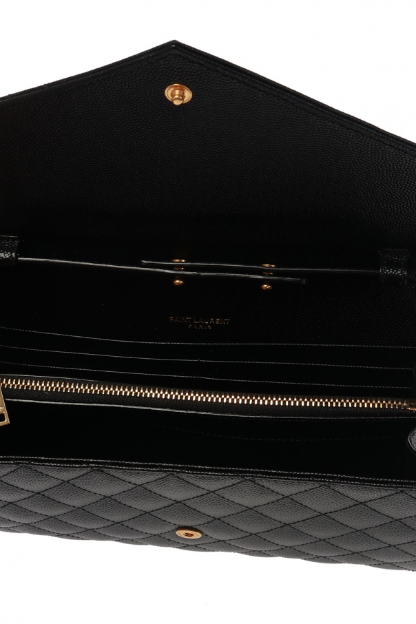 Black wallet from Saint Laurent. This calf leather-crafted item is distinguished by distinct stitching detailing, gold-tone metal hardware including interlocking YSL logo on the front and chain shoulder strap as well as snap fastening and interior with two bills compartments, one slip pocket, ten card slots and one zip pocket perfect for storing your valuables.