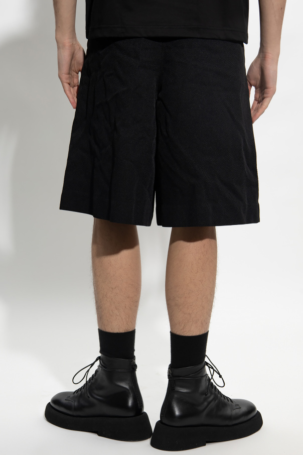 Black ribbed shorts from Comme des Garcons Homme Plus. Fastened with a zip and button, this design features two slip pockets and two buttoned pockets.