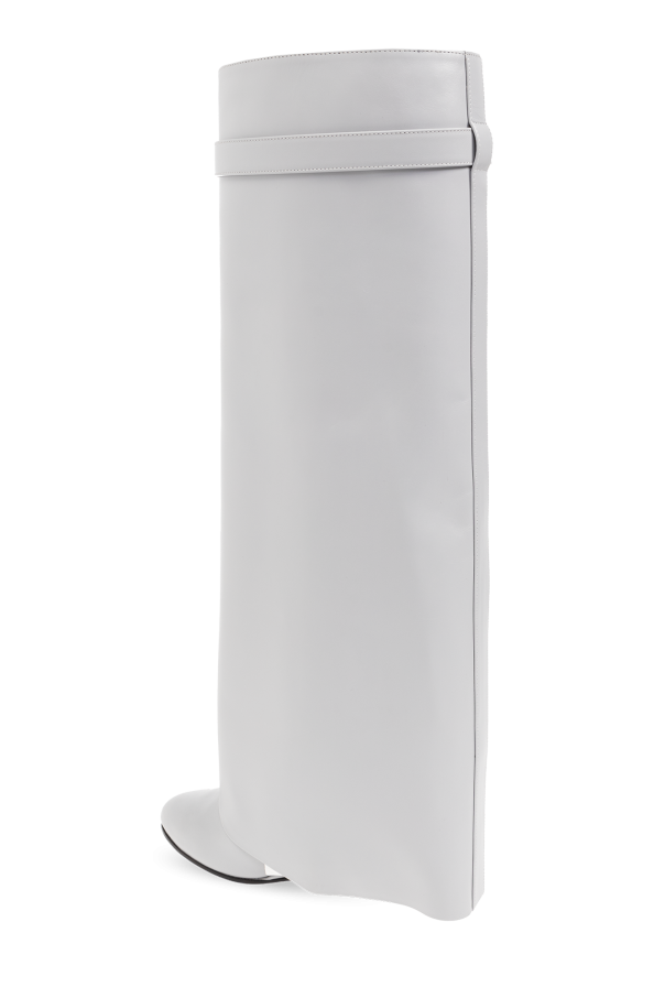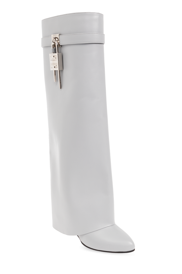 Grey ‘Shark Lock’ wedge boots from Givenchy. Made of calf leather with a slip-on silhouette, this model sits on a black leather sole and features an almond-shaped toe and a belt on the cuff with a metal closure and the brand\'s signature silver-tone ‘4G’ padlock hardware.