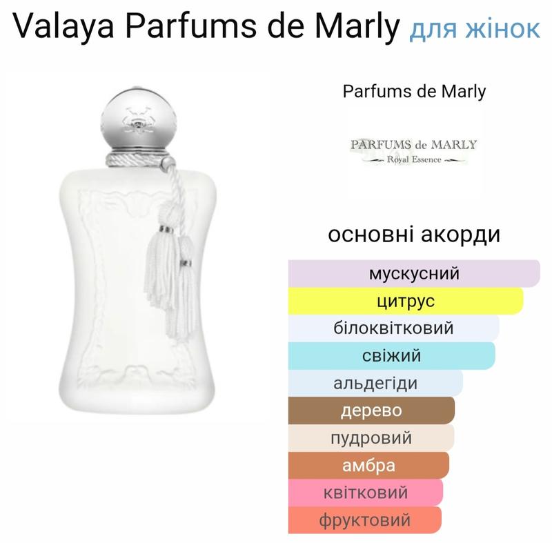 VALAYA від Parfums de Marly — це повітряний і пухнастий аромат, схожий на вуаль із чистої білої бавовни. Цей аромат передає чуттєвість білих квітів і мускусу. Чистий цитрусовий білий квітковий аромат із деревною мускусною основою надає цьому яскравому квітковому аромату чуттєвої нотки.