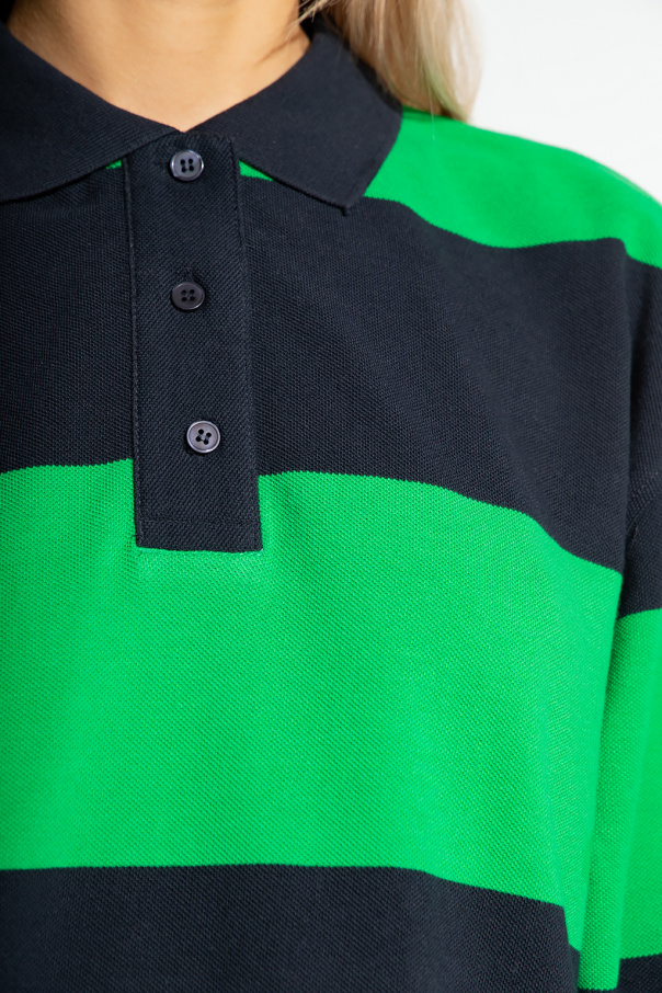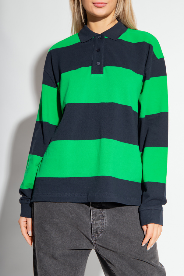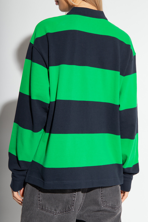 Navy and green ‘Odetta’ polo shirt from Samsoe Samsoe. Made of organic cotton, this long sleeve design features a buttoned collar, stripe pattern and ribbed trims at the hem and cuffs.