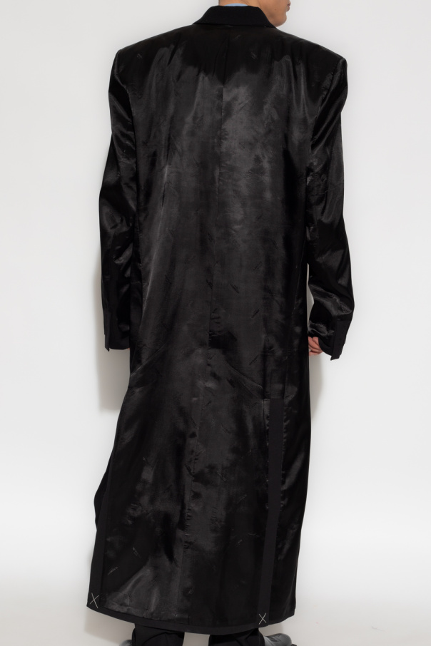 Black blazer with an inside-out effect from VETEMENTS. Made of contrasting fabrics, this design features button fastenings, a monogram pattern, three zip pockets, one slip pocket, long sleeves and double rear vent.
