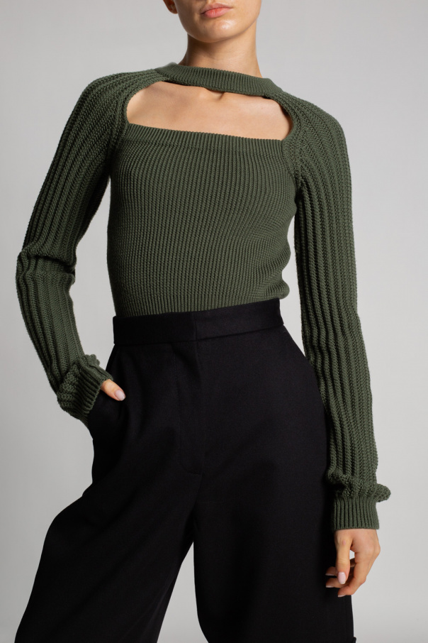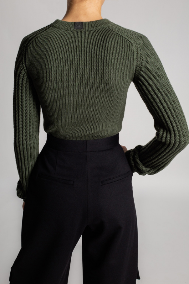 Dark green crewneck sweater from Loewe. Crafted from wool with a cropped silhouette, this style features a cut-out on the front, a logo patch on the back and ribbed edges.