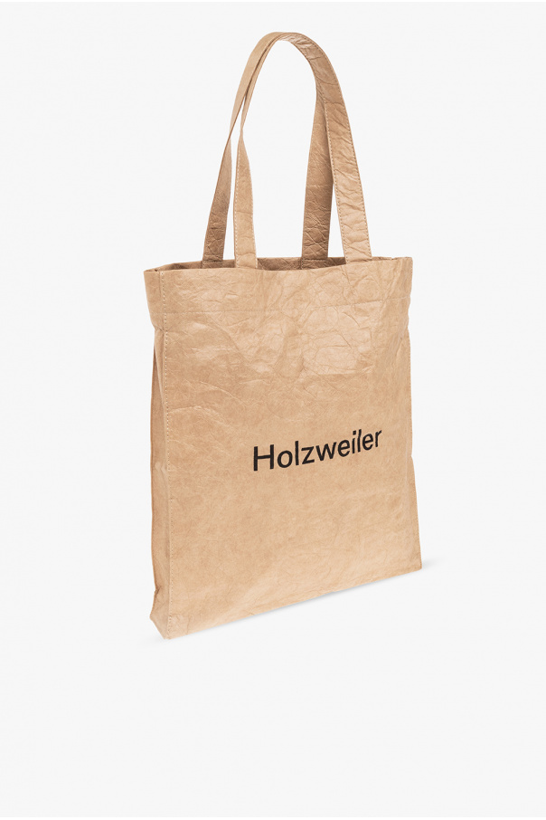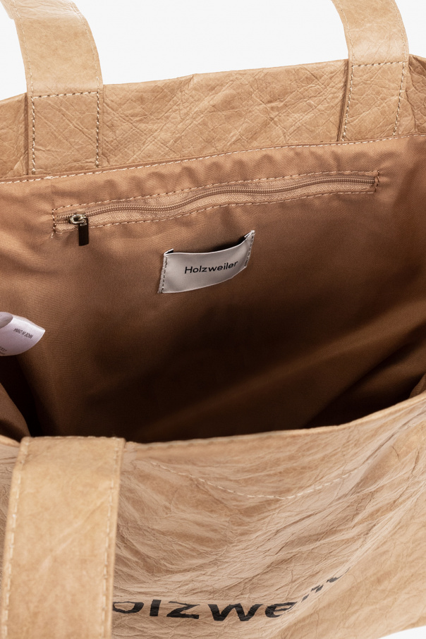Beige ‘Shelter’ shopper bag from Holzweiler. Made of a material with a paper-like texture, this style features a black logo print, two half-round handles and one internal compartment with one zip pocket.