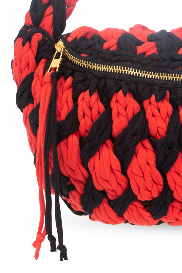 Black and red ‘Knitted’ belt bag from J.W. Anderson. Crafted from organic cotton, this model features a zip fastening, black logo-embossed leather patch, adjustable belt, one internal compartment and gold-tone metal hardware.