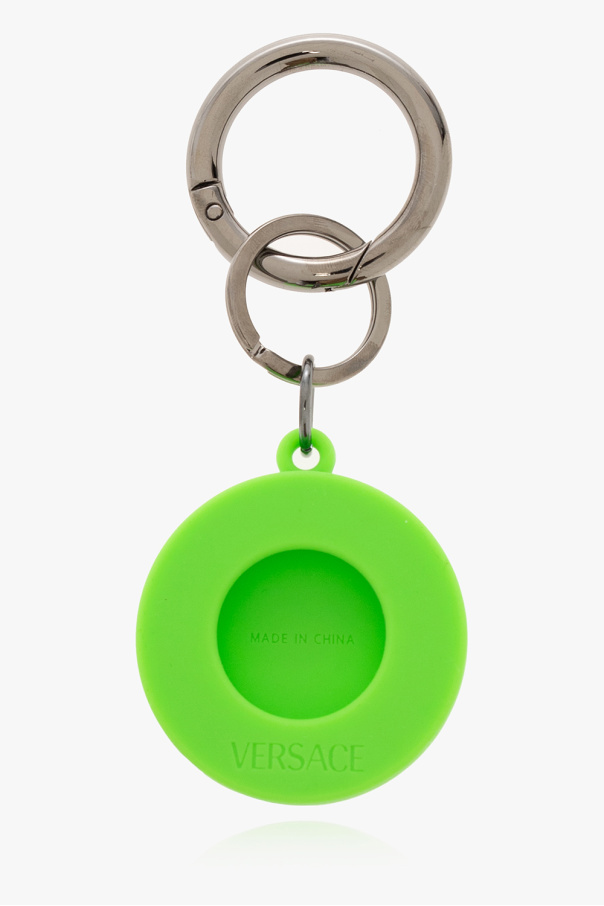 Neon green and dark silver-tone AirTag case from Versace. Made of silicone and metal, this item features the brand’s signature Medusa head detail, key ring and round carabiner hook.