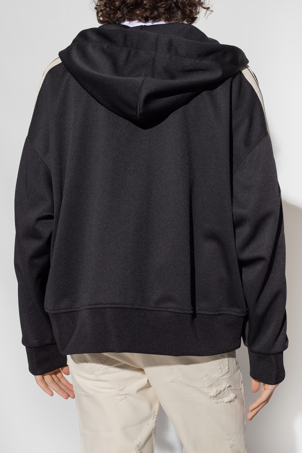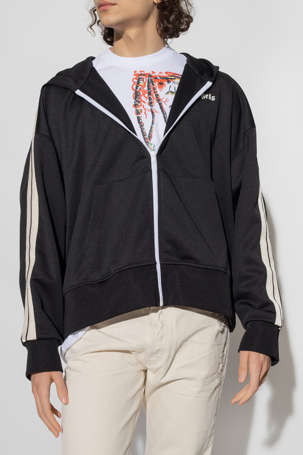Black hoodie from Palm Angels. Fastened with a zip, this design features a logo print, two slip pockets and long sleeves with ribbed edges decorated with beige stripes.