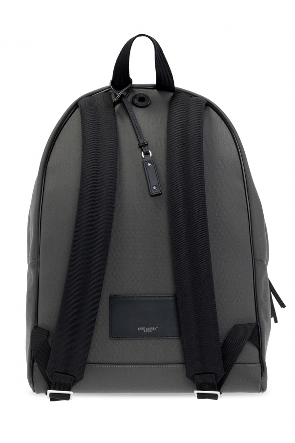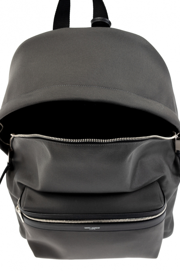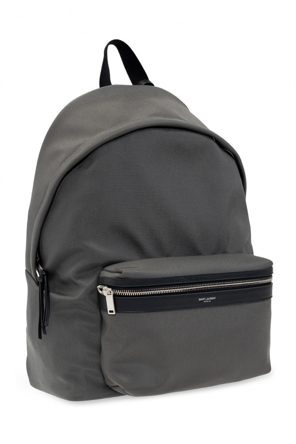 Grey and black ‘City’ backpack from Saint Laurent. Printed at front with the brand\'s logo in silver-tone, this design secures with a two-way zip fastening and features a zip pocket on the front, a half-round top handle, adjustable shoulder straps, silver-tone metal hardware and one internal compartment with one zip pocket and two slip pockets.