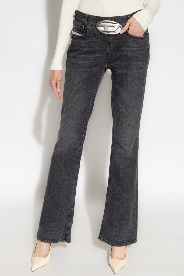 Dark grey ‘1969 D-EBBEY’ bootcut jeans from Diesel. Fastened with a side zip and button, this low rise pair features a metal D logo in silver-tone, multicolored logo patches, five slip pockets and flared legs.