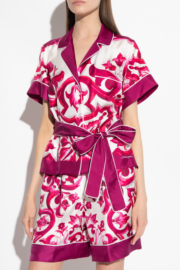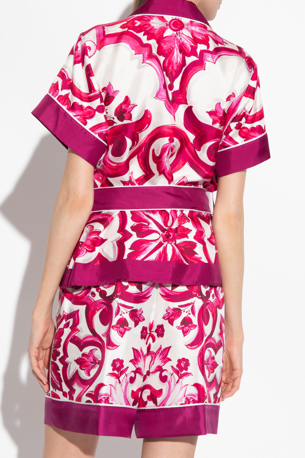 White and pink shirt from Dolce & Gabbana. Made of silk, this style fastens with buttons and showcases a floral print inspired by majolica tiles from Caltagirone. It is complete with a waist-cinching tie belt, short sleeves and a slip chest pocket.