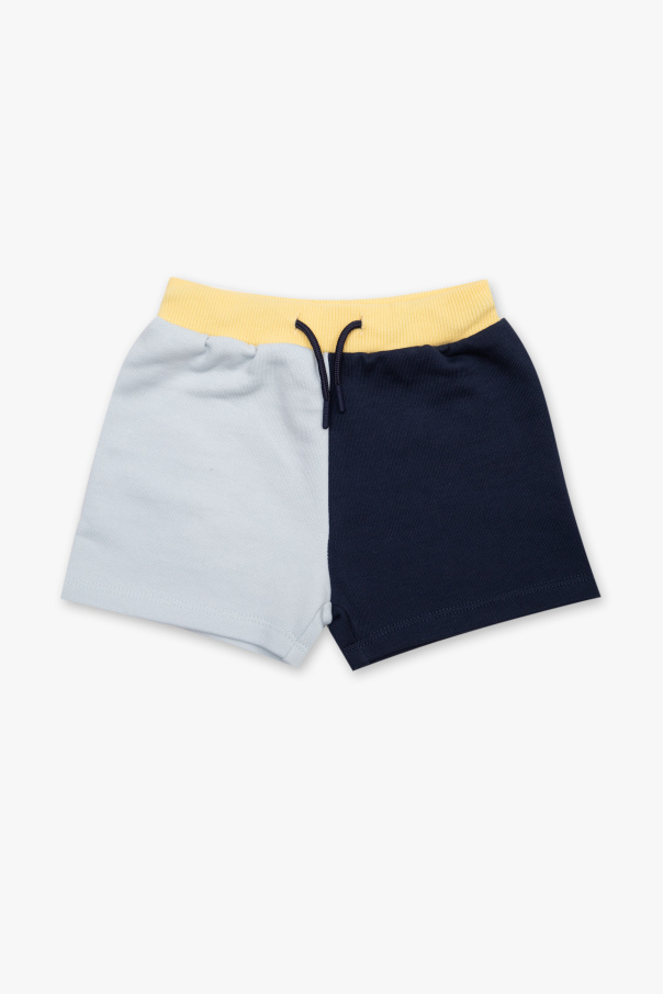 White, blue and yellow top and shorts set from Kenzo Kids. Decorated with a print and embroidered logo pattern, this set features a snap-fastened top and shorts with an elastic waistband.
