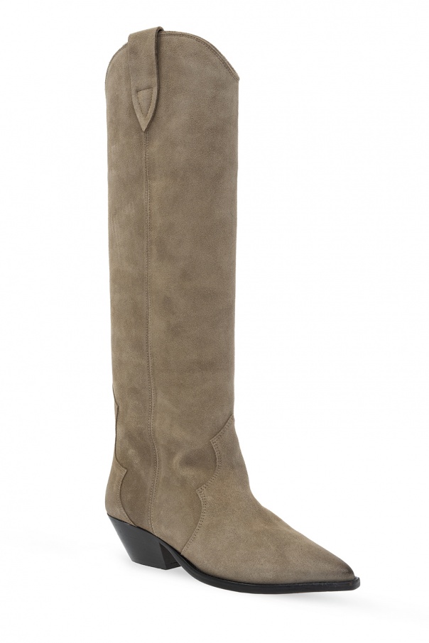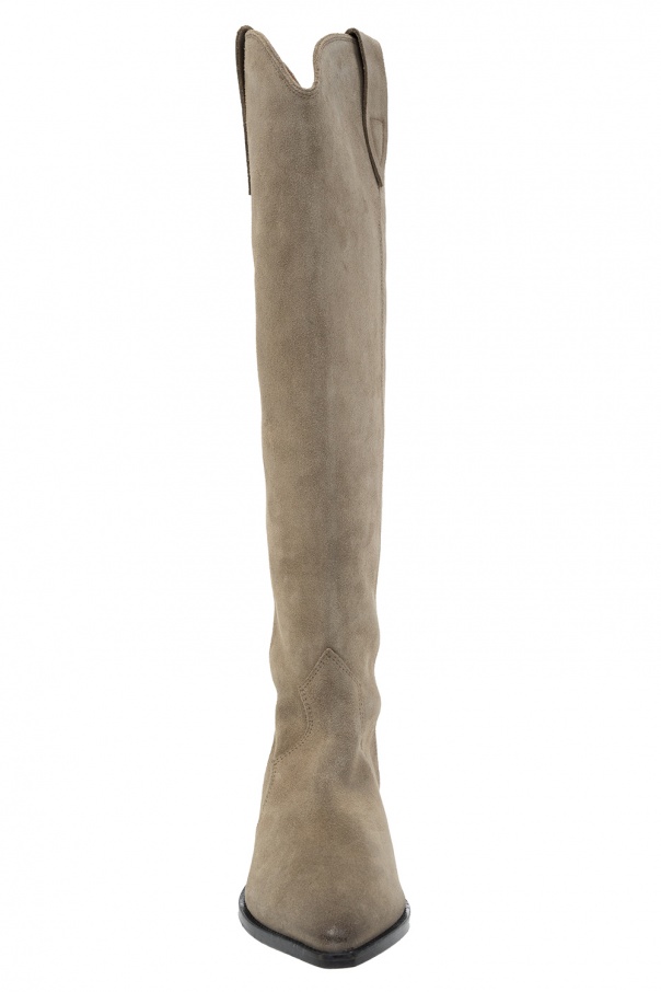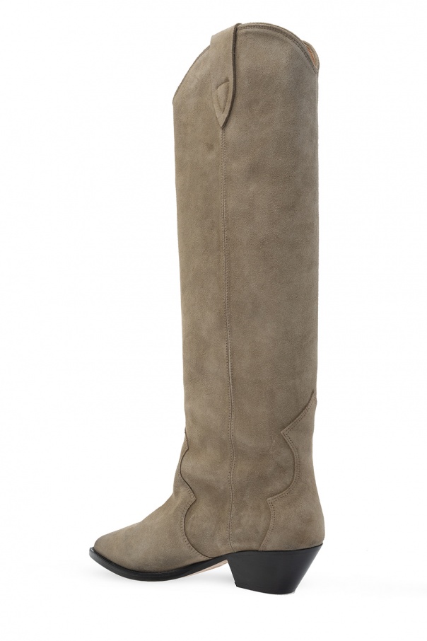 Beige and grey 'Denvee’ heeled knee-high boots from Isabel Marant. Crafted from calf leather with a pointed toe silhouette, they sit on a beige and black leather sole.