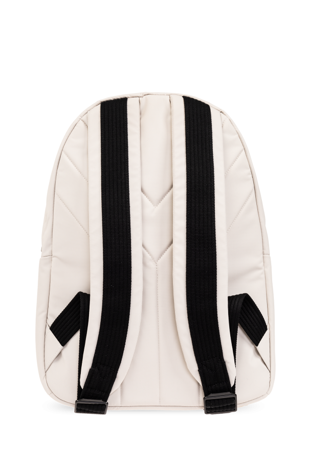 Cream and black backpack from Y-3 Yohji Yamamoto. Made from fabric and trimmed with leather, this design fastens via a two-way zip and showcases a frontal pocket with a printed black logo, one half-round handle, adjustable shoulder straps, silver-tone metal hardware and one internal compartment with one slip pocket and one zip pocket.
