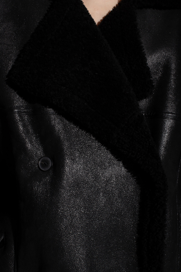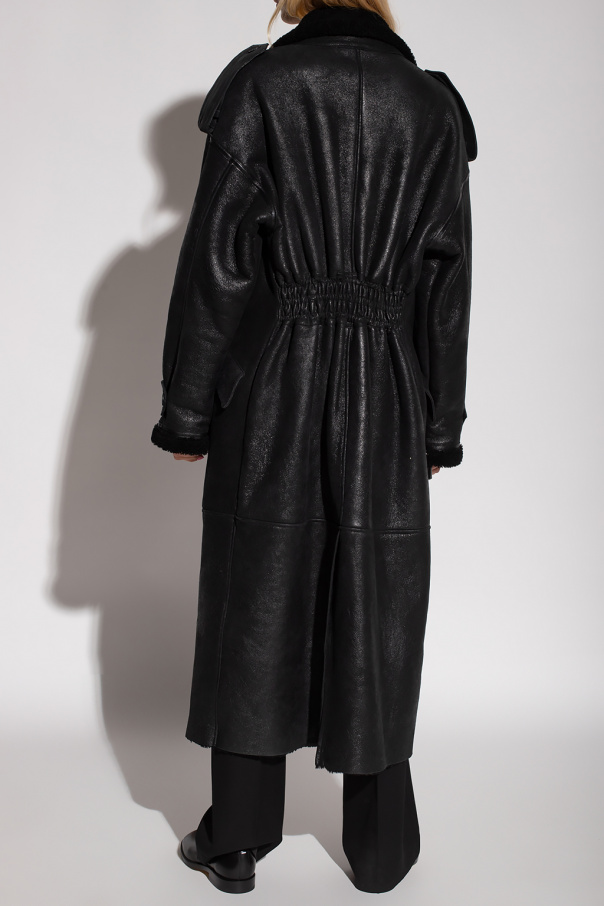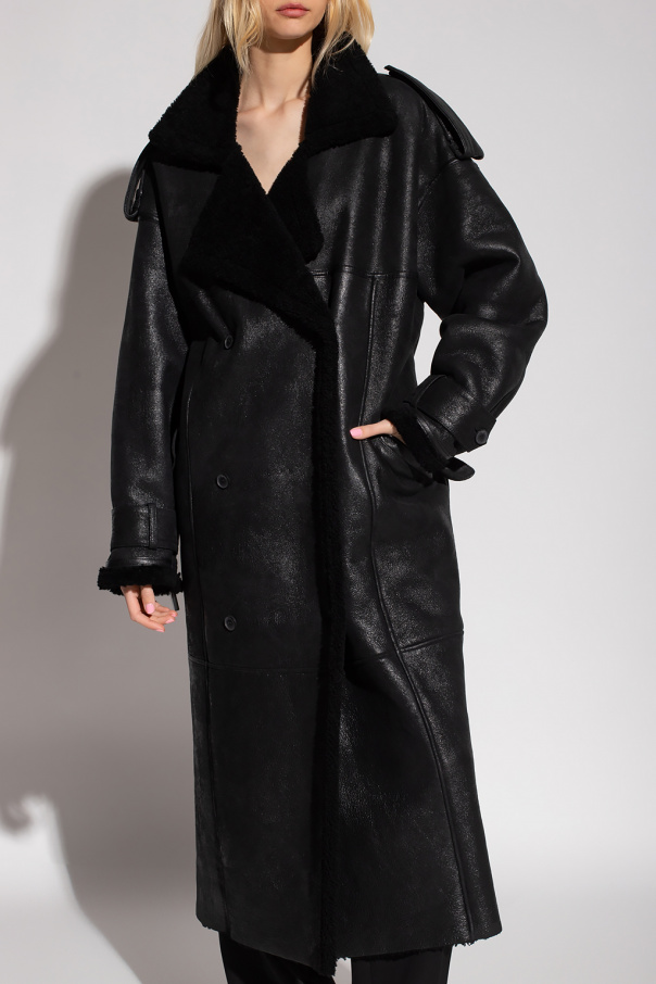 Black ‘Jordan’ long coat from The Mannei. Crafted from sheep leather with an oversize, double-breasted silhouette, this style features button fastenings, an elastic trim at the back, shoulder epaulettes, cream shearling trims on the collar and cuffs, two flapped pockets and a single back vent.