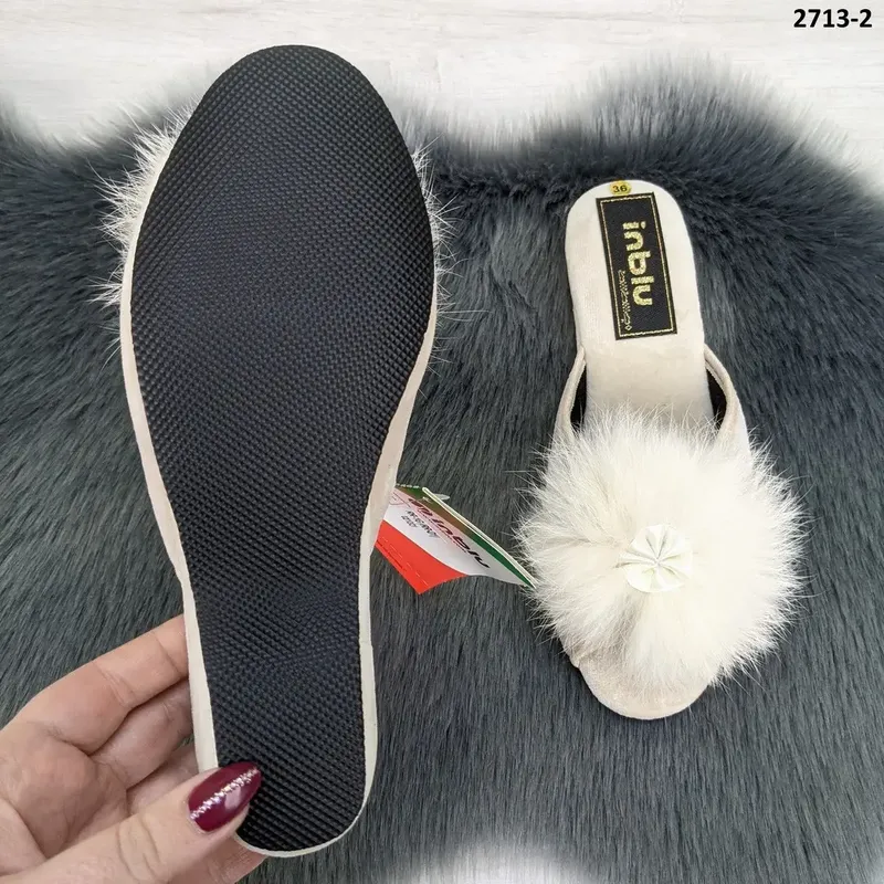 Элегантные домашние тапочки на танкетке с открытым носочком и пушком. Высота каблучка под пяткой 4 см. Украшены помпоном из натурального меха.
