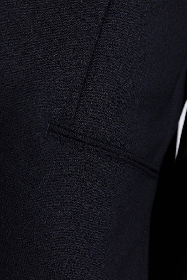 Introducing the Emporio Armani Navy Blazer with Notched Lapels, an epitome of sartorial elegance and sophistication. This blazer, crafted with meticulous attention to detail, combines a classic design with a touch of modernity. Fabricated from a luxurious blend of wool, polyester, viscose, and elastane, the blazer offers both comfort and a refined appearance. The subtle texture of the fabric hints at its superior quality, ensuring you stand out at any formal occasion. Featuring a traditional silhouette with notched lapels and a two-button closure, this blazer is designed to enhance your ensemble with effortless style. The addition of flap pockets and a chest pocket adds a functional yet fashionable dimension. The impeccable fit, accentuated by classic rear seams, ensures the blazer drapes elegantly without constricting movement, making it ideal for the office or any formal event. Why Choose This Product? Timeless design with notched lapels Luxurious fabric blend for comfort and elegance Functional pockets for added convenience Exquisite tailoring by Emporio Armani