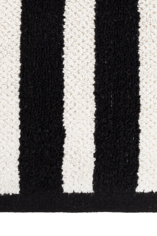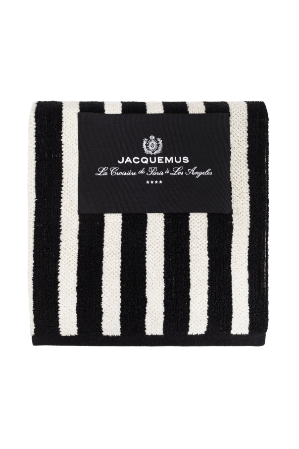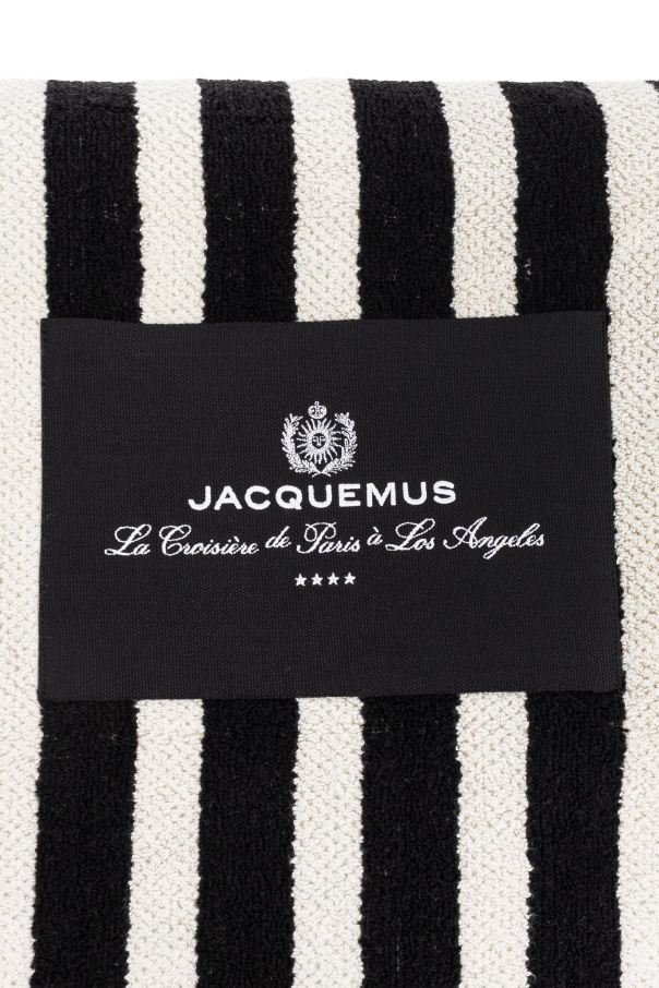 Introducing the exquisite Jacquemus Logo Towel, a quintessential blend of modernity and elegance, reflecting the visionary style of Simon Porte Jacquemus. This unisex beach towel is adorned with chic black-and-white vertical stripes, epitomizing timeless sophistication. Crafted from a plush blend of cotton and linen, it promises an unparalleled tactile experience. A luxurious black patch, emblazoned with the iconic Jacquemus logo and the evocative inscription \"La Croisière de Paris à Los Angeles,\" adds a touch of exclusivity. Star symbols intricately woven into the design further enhance its distinctiveness. Part of the beach collection, this towel is not just a practical accessory but a statement piece, embodying the fusion of functionality and high fashion. The monochrome palette ensures it remains a versatile addition to any discerning individual\'s beachwear ensemble. Why Choose This Product? Exquisite design with black-and-white stripes Luxurious blend of cotton and linen Iconic Jacquemus branding with unique inscription Unisex, part of the exclusive beach collection Perfect fusion of style and practicality