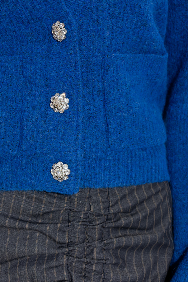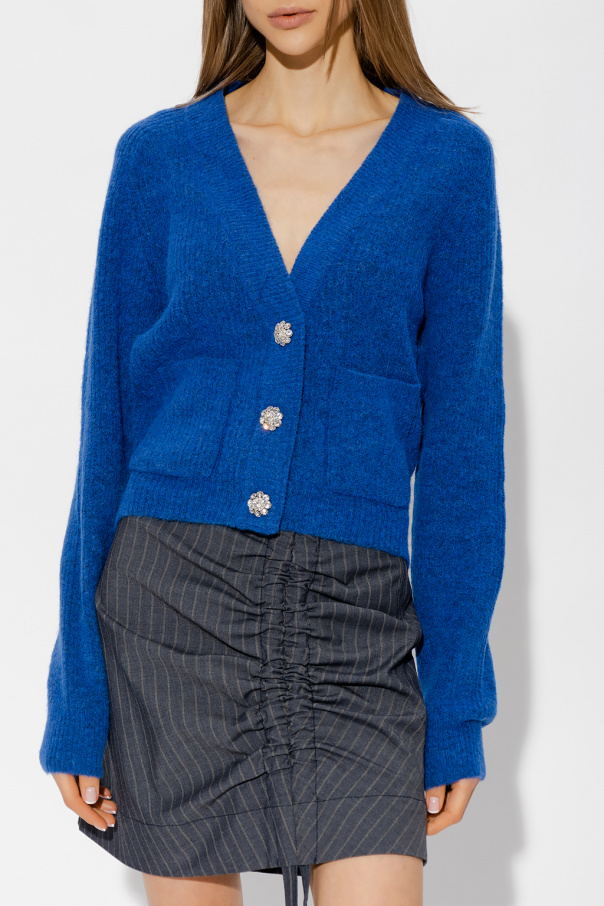 Blue cardigan from Ganni. Made of an alpaca and wool blend, this long sleeve garment features snap fastenings, sparkling appliqués, two slip pockets and ribbed trims at the hem and cuffs.