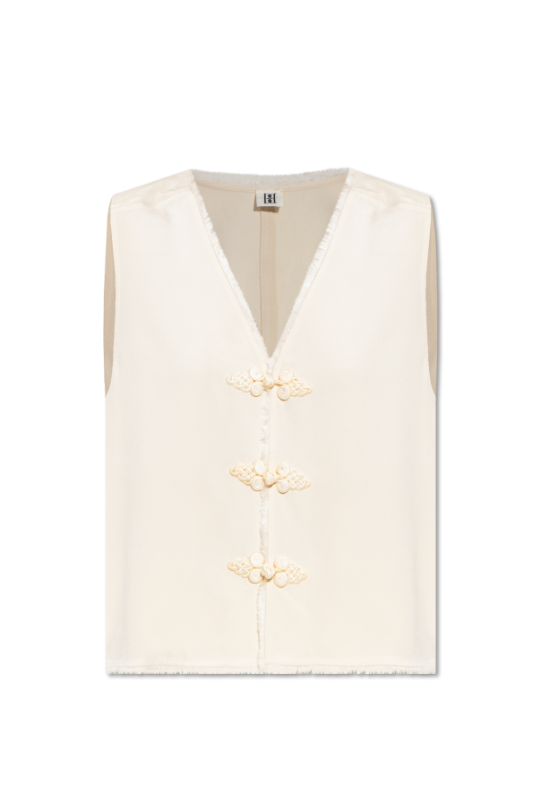 Cream ‘Esma’ vest from By Malene Birger. Fastened with decorative buttons, this V-neck design features a fringed trim.