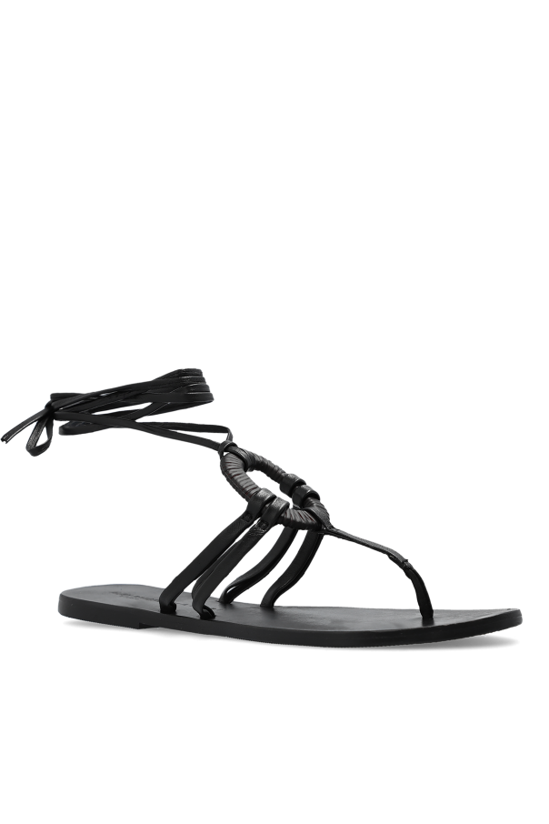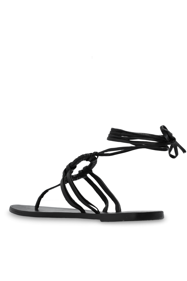 Introducing the epitome of summer elegance: the Manebi x Alex Riviere Studio Sandals. Crafted with meticulous attention to detail, these sandals embody a seamless blend of luxury and casual chic. The dominant black color enhances their versatility, making them a quintessential addition to any sophisticated wardrobe. The sandals are adorned with slender, elongated straps, meticulously designed for wrapping around the ankle, thus accentuating the leg\'s contour with grace and style. The front is embellished with a distinctive, woven detail, adding a unique touch that sets these sandals apart. Contrary to initial impressions, these sandals feature a flat rubber sole, ensuring both comfort and stability, making them suitable for a variety of occasions. The soft, flexible nature of the leather straps promises an unparalleled wearing experience, while the minimalist design, punctuated with subtle yet refined details, speaks to the luxury characteristic of Manebi\'s collaborative efforts with Alex Riviere. The designer\'s logo, discreetly placed on the sandal\'s insole, serves as a hallmark of quality and authenticity. Why Purchase This Product? Elegant, slim design with long, ankle-wrapping straps accentuates the leg\'s silhouette. Unique, woven front detail provides a distinctive character. Made from high-quality leather, ensuring both comfort and durability. Flat, rubber sole offers optimal comfort for all-day wear. Versatile and stylish, perfect for both casual and formal occasions.