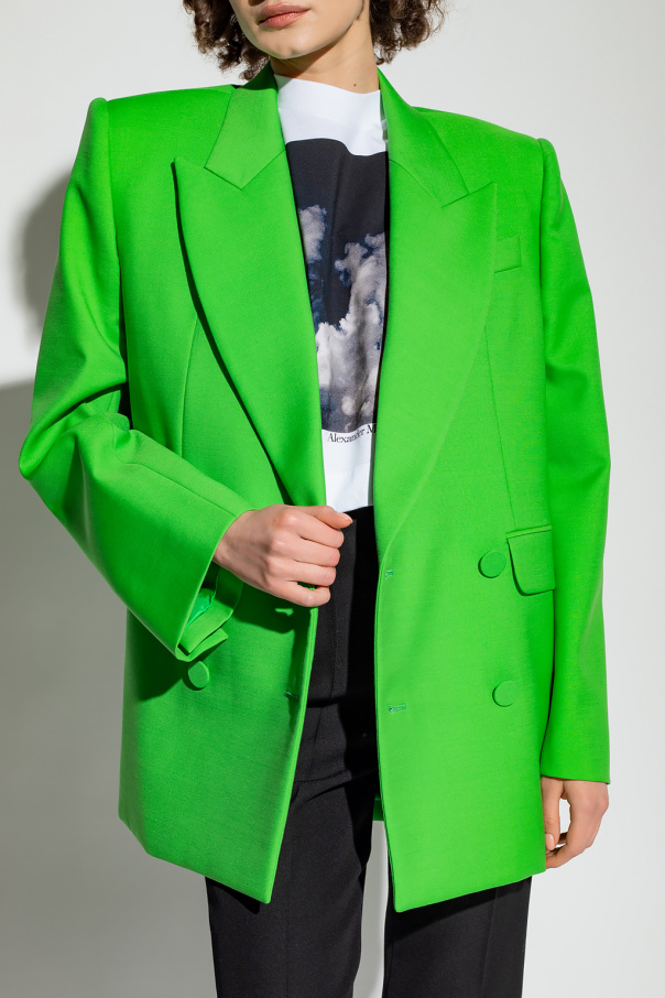 Green blazer from Alexander McQueen. Crafted with a double-breasted silhouette, this style features button fastenings, peak lapels, two flapped pockets and one slip pocket on the front, a single back vent and long sleeves.