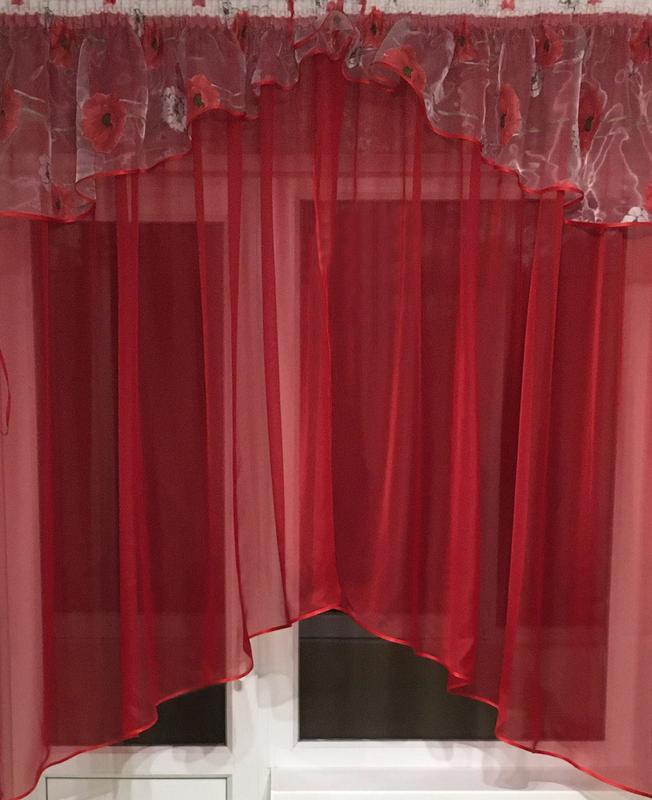 Тканина: шифон(вуаль)+органза Розміри: ширина в розтягнутому вигляді - 3 м; (стягується на розмір вашого карниза - на фото в стягнутому вигляді); висота (боковушки) - 1,7 м; висота (середина) -1,4 м; Спосіб кріплення: тасьма. Тюль для кухні дуже важливий елемент декору. Правильно підібрана тюль підкреслить вишуканість інтер'єру, додасть кухні затишку і комфорту. 100 % оплата на карту або 100 грн передоплати інша сума післяплатою.