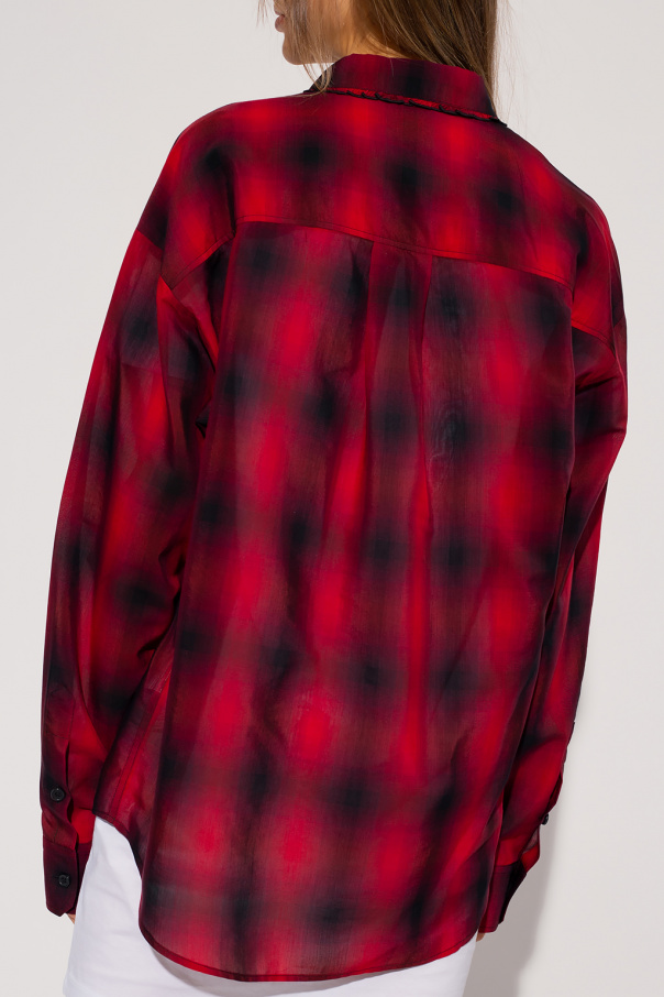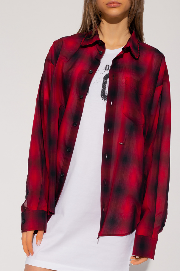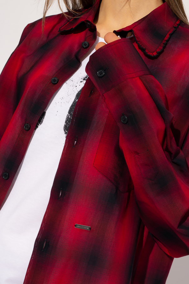 Red and black ‘Ex-Boyfriend’ shirt with a collar from Dsquared2. Fastened with buttons, this model features a check pattern, ruffled collar, metal logo appliqué in silver-tone, slip pocket and long sleeve with button cuffs.