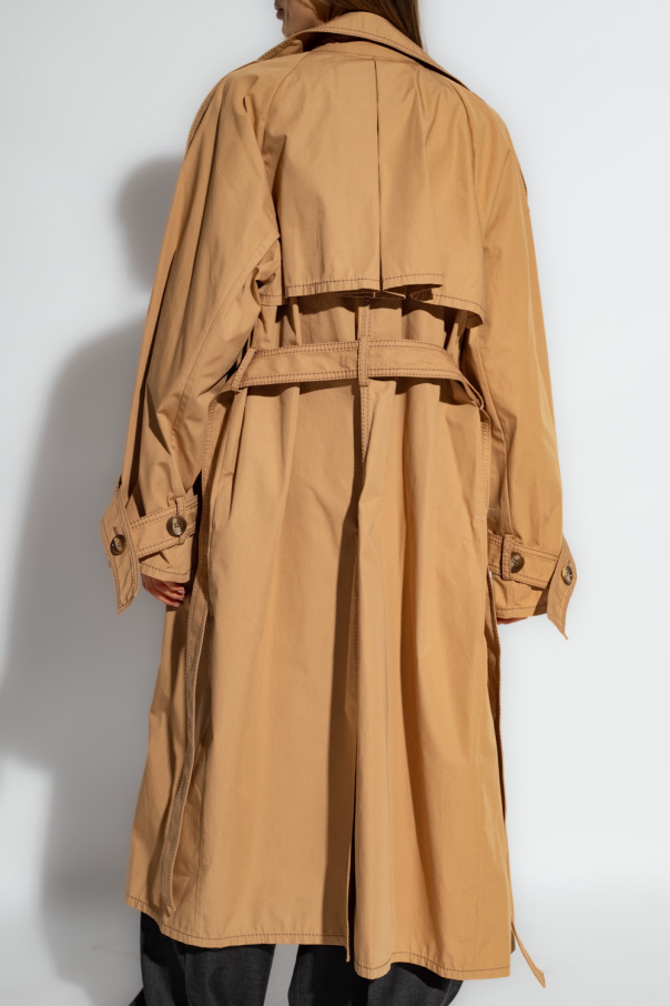 Light brown trench coat from Acne Studios. Crafted from cotton with a long fit, this style is cinched with a tie belt at the waist and features a collar with a double storm flap, button fastenings, shoulder epaulettes, two slip pockets, long sleeves with buttoned cuff adjusters and a single back vent.