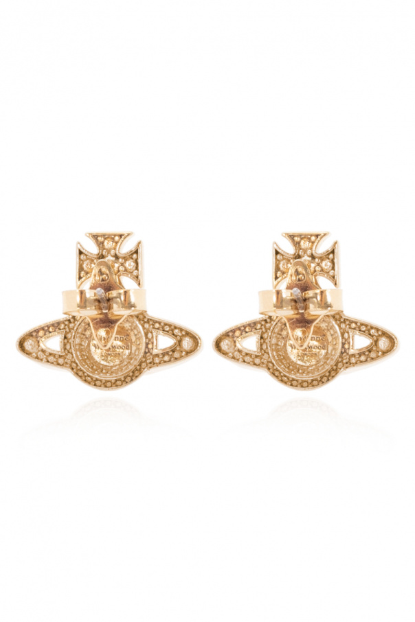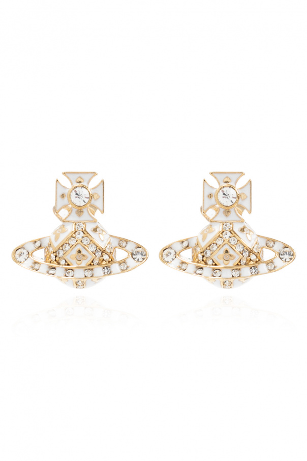 Gold-tone and white earrings from Vivienne Westwood. Made of brass, they secure with a stud fastener and showcase a logo pattern and glistening details.