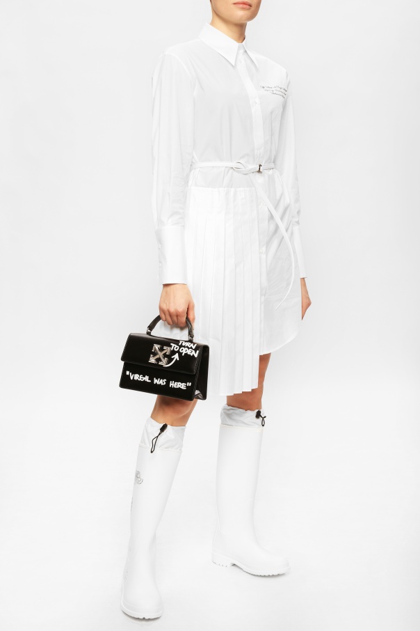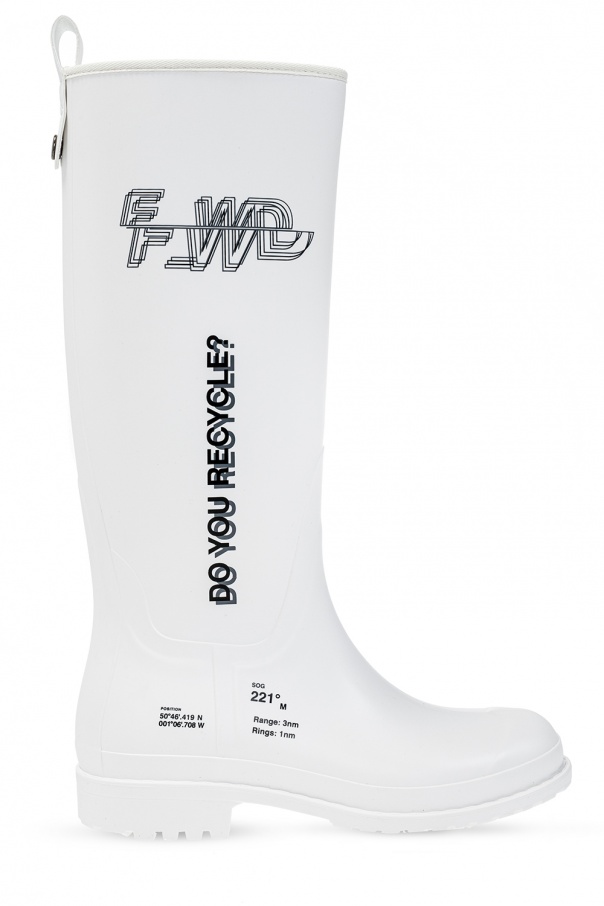 White rain boots from F_WD. Crafted from recycled rubber, this pair sits on a tonal sole and showcases black graphic prints including the brand\'s logo.