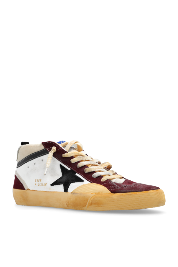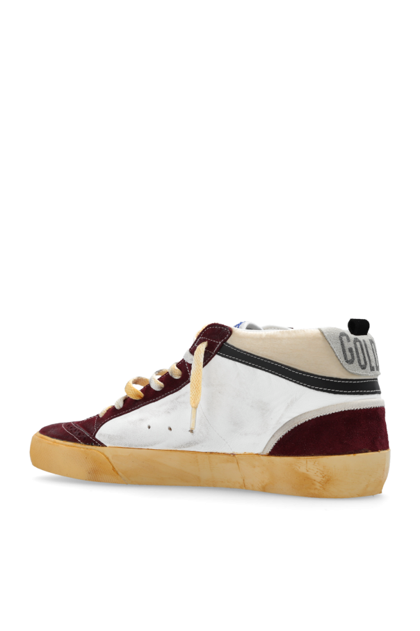 Maroon and white ‘Mid Star’ high-top sneakers from Golden Goose. Crafted from soft nappa leather with suede and fabric overlays, this lace-up pair features the brand’s signature star in black, embossed logo in gold-tone, vintage effect and brown rubber sole.
