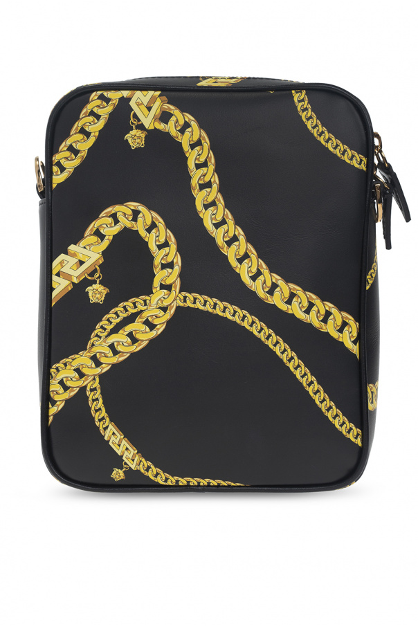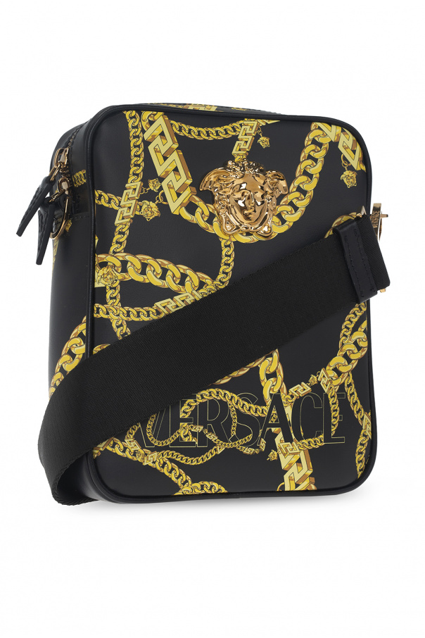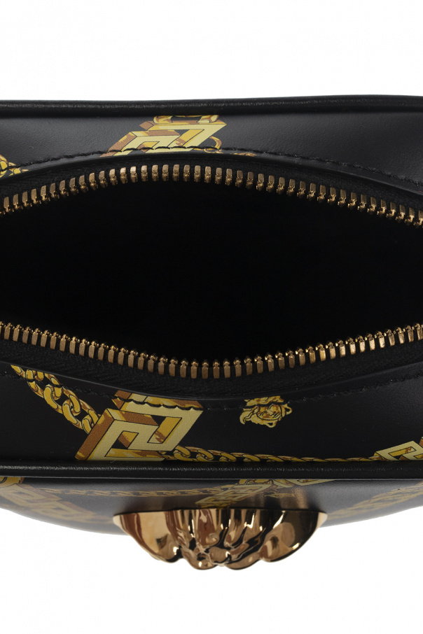 Black ‘La Medusa Mini’ patterned shoulder bag from Versace. Made of calf leather, this design secures with a zipper and showcases a signature Medusa application on the front, a detachable and adjustable shoulder strap, gold-tone metal hardware and one internal compartment with a slip pocket.