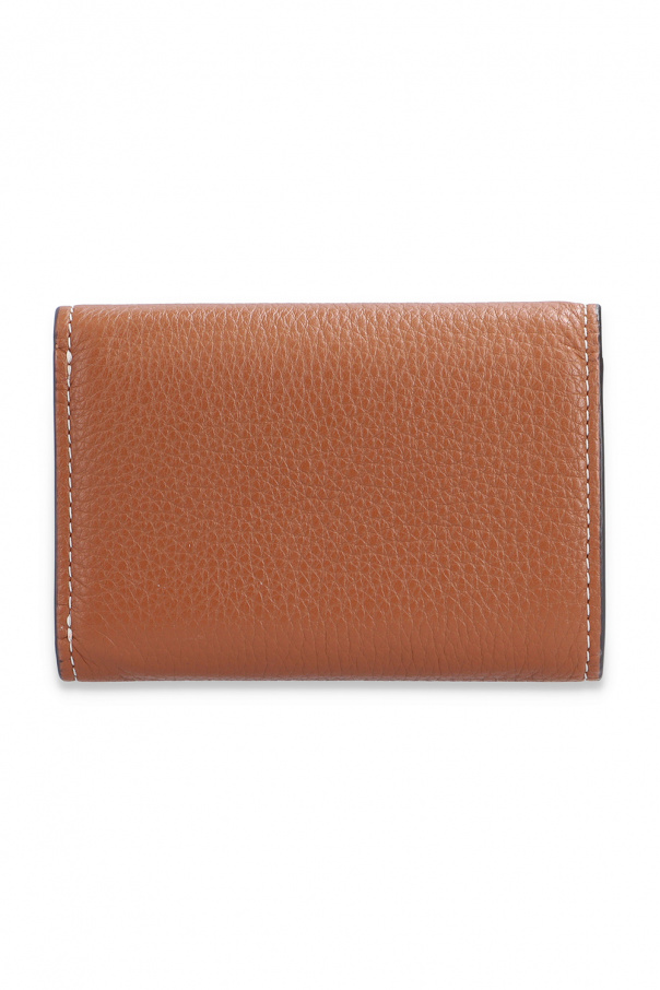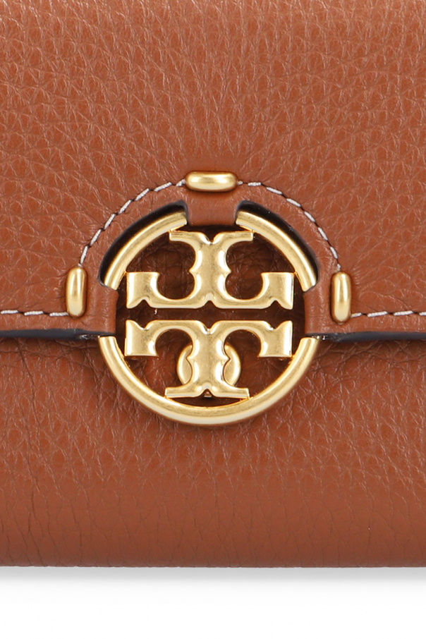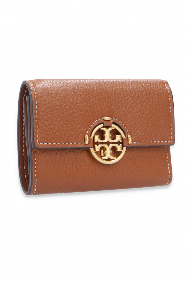 Brown wallet from Tory Burch. Crafted from leather, this design fastens via a snap and showcases a logo emblem. It is complete with gold-tone metal hardware, a zip pocket on the side and an interior with a bill compartment, two slip pockets and twelve card slots.