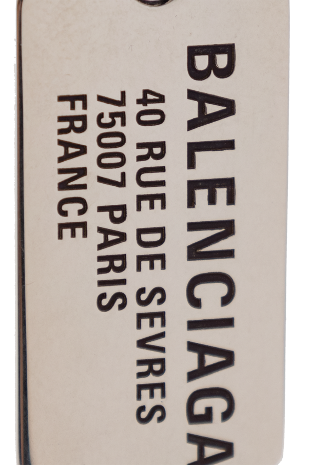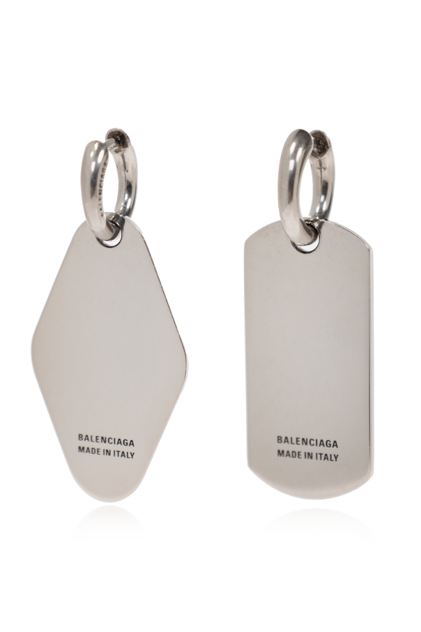 Two different earrings from Balenciaga. Made of silver-tone brass, they secure with snaps and showcase engraved detailing with the brand\'s logo.