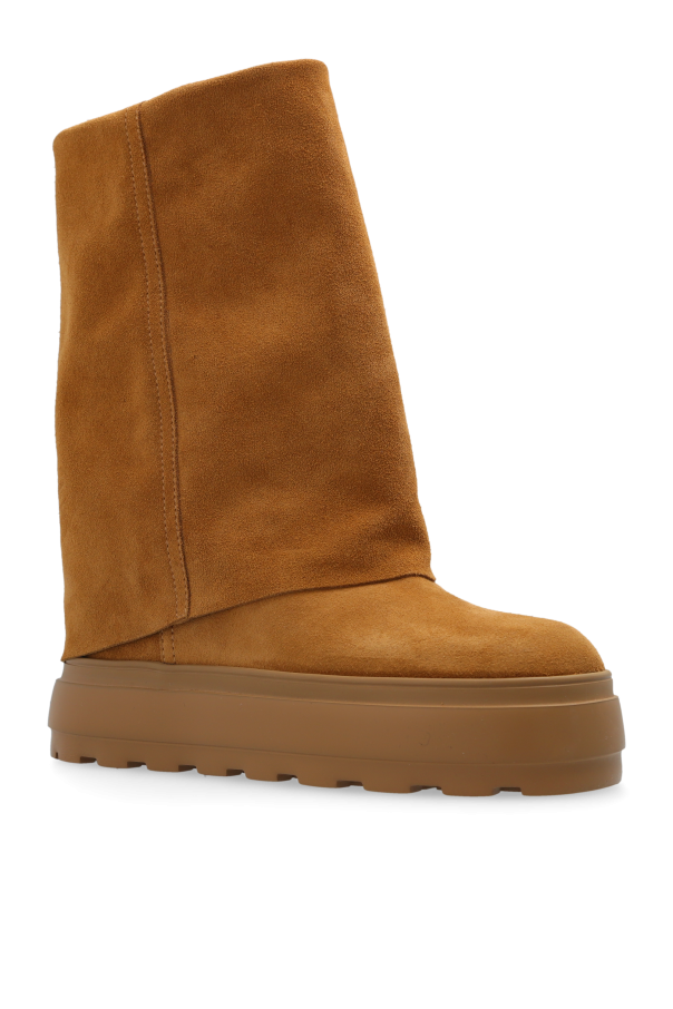 Introducing the ‘New Double Face’ Boots from the exclusive collection by Casadei. These ankle boots are a masterpiece of modern design and craftsmanship, showcasing a sleek, minimalist aesthetic that seamlessly blends into any wardrobe. Crafted from luxurious suede, the boots feature a high, wide shaft that tapers elegantly above the ankle, providing both a stylish silhouette and a comfortable fit. The rich, brown hue exudes sophistication, while the absence of additional patterns or embellishments highlights the exquisite material and clean lines of the design. Ensuring ultimate comfort, the interior of the boots is lined with soft leather, making them ideal for all-day wear. The robust, rubber sole is equipped with an anti-slip tread, offering excellent grip and stability, perfect for casual outings during colder days. At the rear of the sole, the subtle yet distinctive \'CASA\' logo pays homage to the brand\'s heritage and exceptional quality. Embrace the blend of elegance and practicality with these versatile boots, a true testament to Casadei\'s legacy of innovation and style. Why Choose These Boots? Luxurious suede material for a soft, elegant look Comfortable leather lining for all-day wear Anti-slip rubber sole for superior traction Minimalist design with a sophisticated brown color Exclusive craftsmanship by Casadei