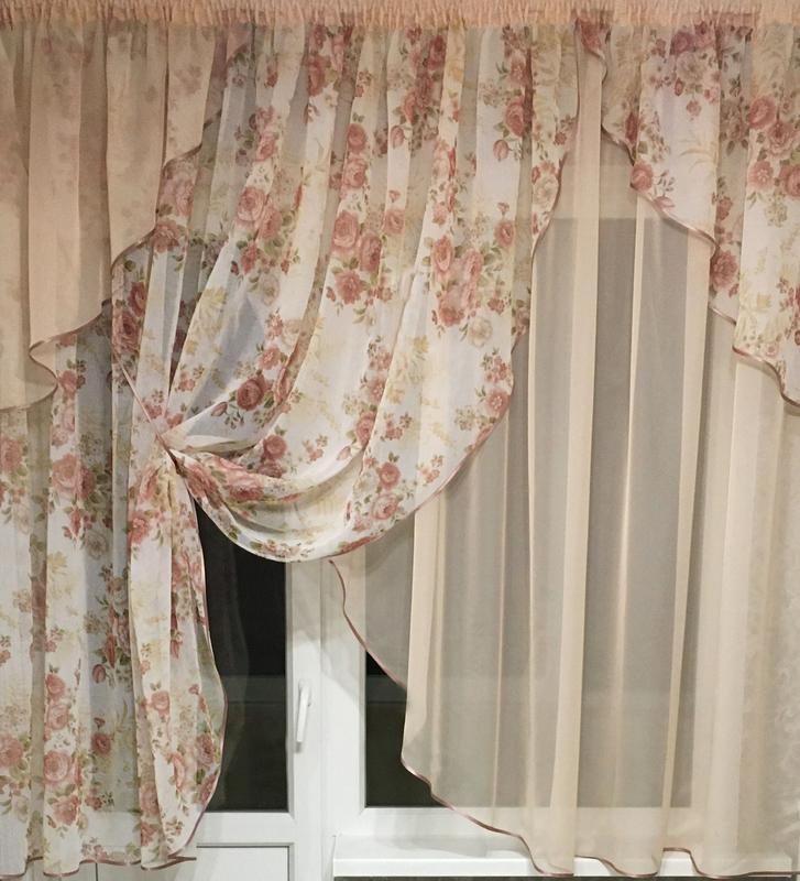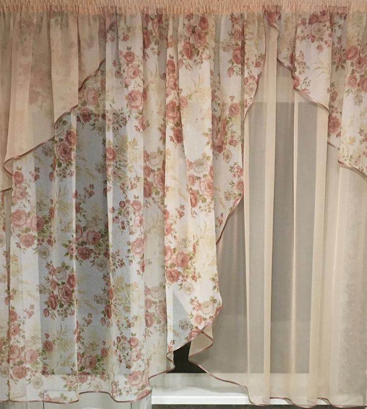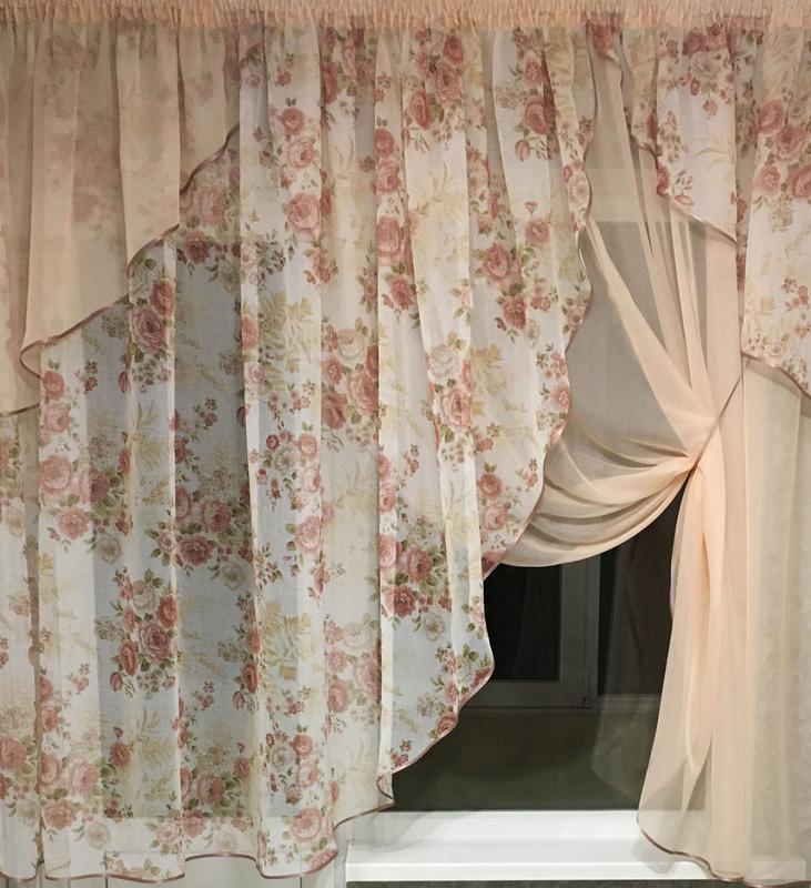 Тканина: шифон(вуаль) + органза Розміри: ширина ― 4 м; висота (боковушки) ― 1,7 м; висота (середина) - 1.3 м. Спосіб кріплення: тасьма. Тюль для кухні дуже важливий елемент декору. Правильно підібрана тюль підкреслить вишуканість інтер'єру, додасть кухні затишку і комфорту.