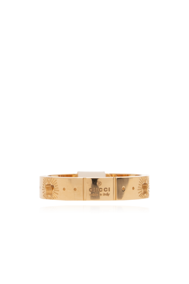 Gold ring with a cut-out star motif and an engraved logo from Gucci. Made of 18k yellow gold.