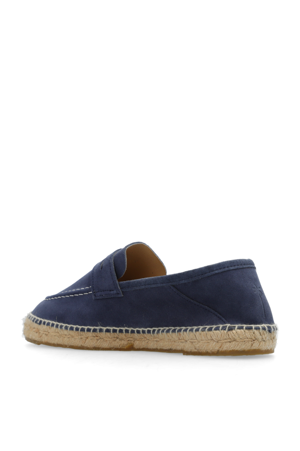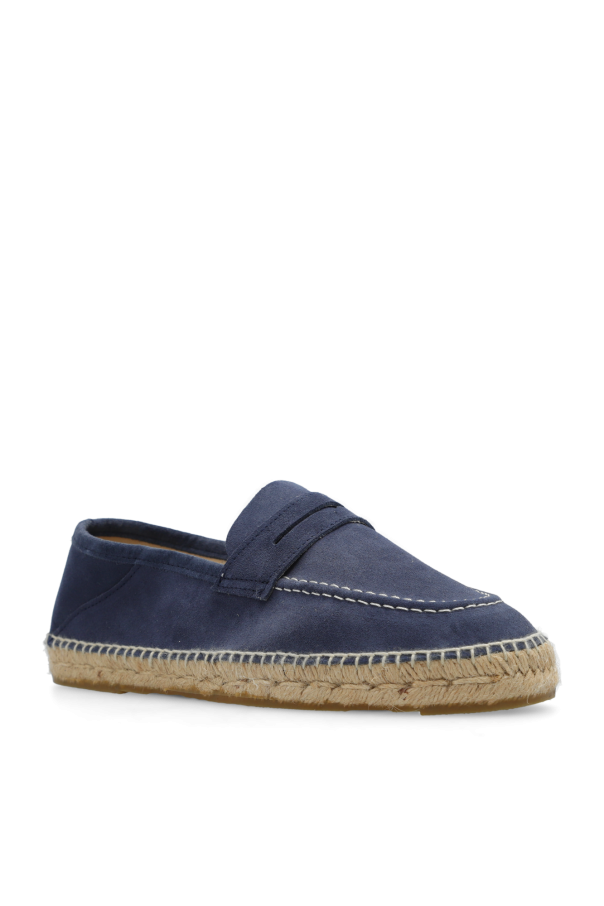 Blue espadrilles from Manebi. Crafted from suede, this pair features contrasting stitches, a decorative strap, embossed logo and beige sole constructed from jute and rubber.