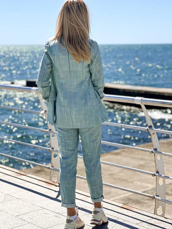 Ткань: плотный лен меланж + серебристый кантик на пиджаке и брюкахСостояние: НовоеЦвет:- Голубой