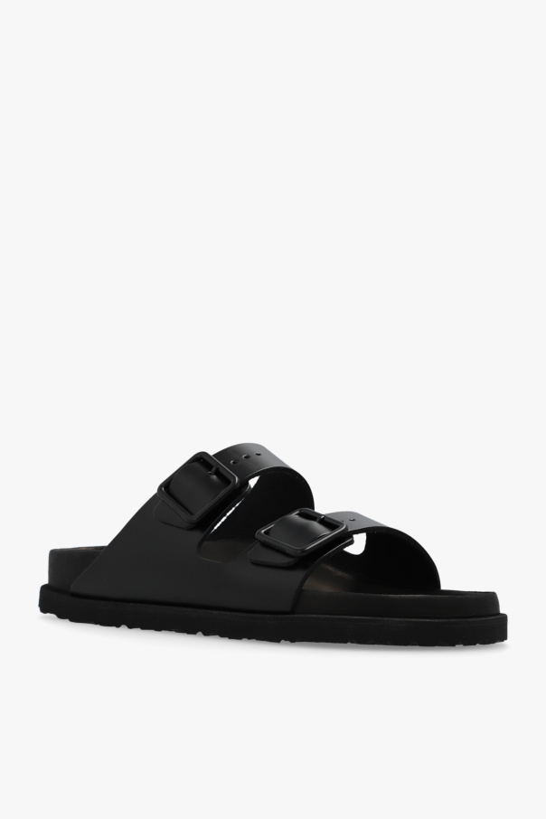Black ‘Arizona Avantgarde’ slides from Birkenstock 1774. This pair has a standard upper made from leather, buckle strap fastenings, embossed logo to the side, anatomically shaped cork-latex footbed and black EVA foam sole.